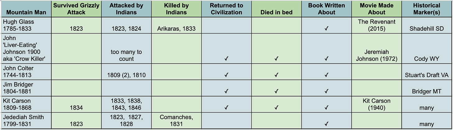 Amazingly, Glass is hardly the lone example of mountain men for whom cheating death was part of the job description. I've put together a chart to summarize a few other mountain men to demonstrate the similarities. And by no means is this list conclusive. These nuts were as plentiful as the acorns on the oak in my back yard.